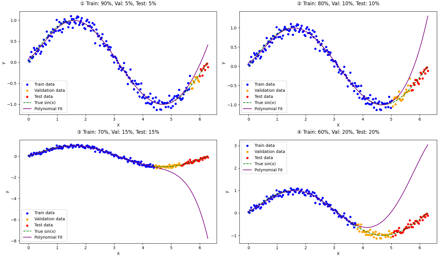 トレーニングデータセットを全体の①90%、②80%とした場合は比較的よく適合できている一方で、トレーニングデータセットを全体の③70%、④60%とした場合は真の関数から大きく外れている箇所があるのが確認できます。